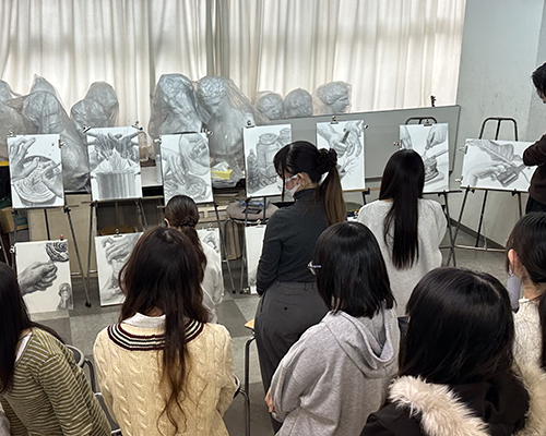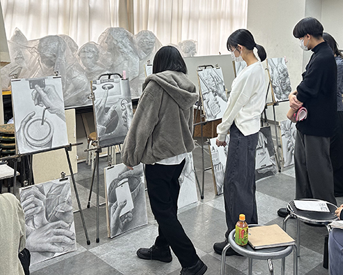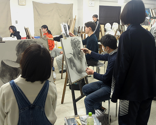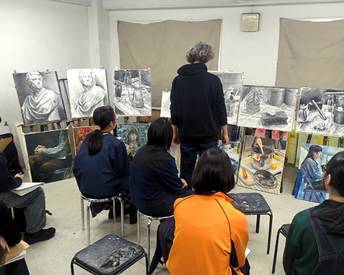 他のアトリエでもそれぞれのモチーフで意識することや受験で役立つ考え方、そして自分たちが描いた作品1点1点へのアドバイスが聞ける講評が行われています。