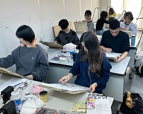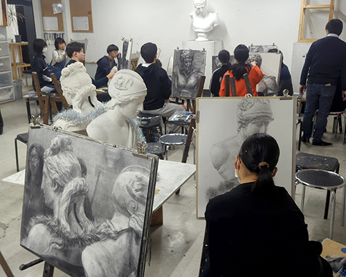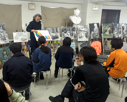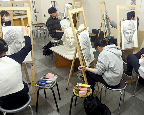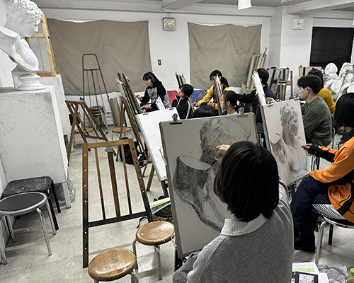 それ以外にも木炭デッサンや石膏デッサン、油彩画や構成着彩などに初めてチャレンジする生徒はそれぞれの初歩ガイダンスを受けて制作します。