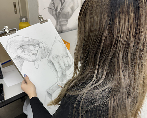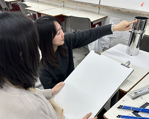 ここでは石膏デッサンにチャレンジする生徒が制作のコツを聞いています。