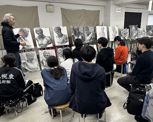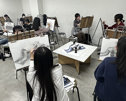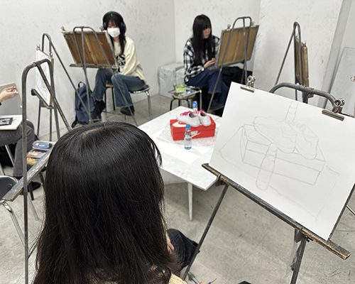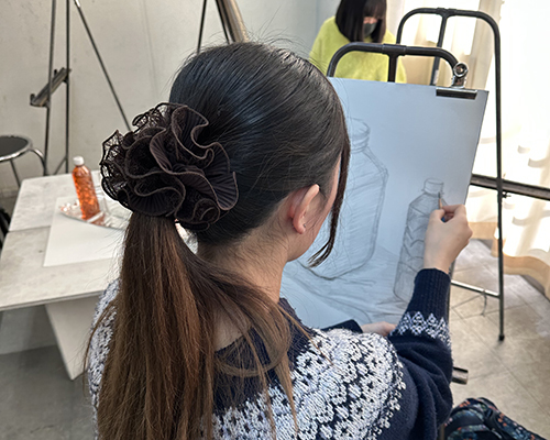 このアトリエではデッサンの基本についての解説を聞き、本格的なデッサンに向けた準備をしています。