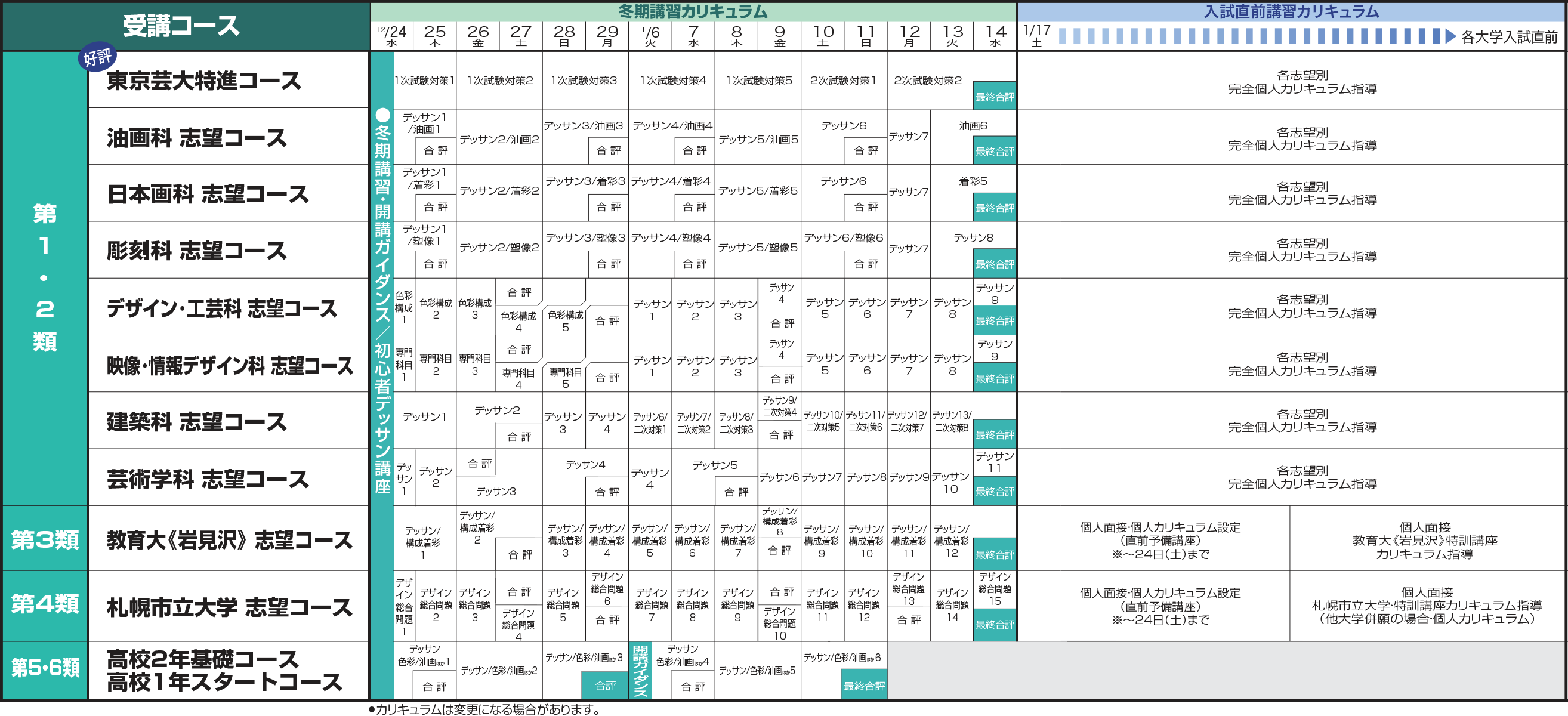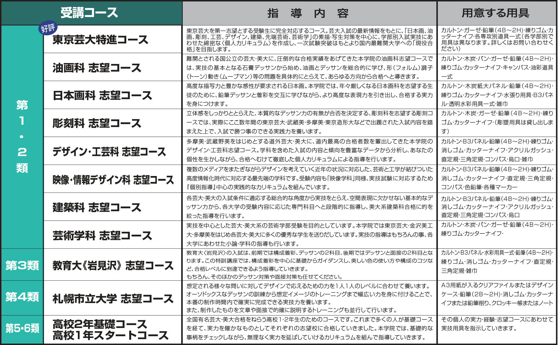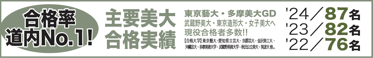 ●札幌市立大学の前期日程に対応した実技力アップのための特訓講座です。1人1人の個性にあわせて、確かな入試実技への対応力を養成します。