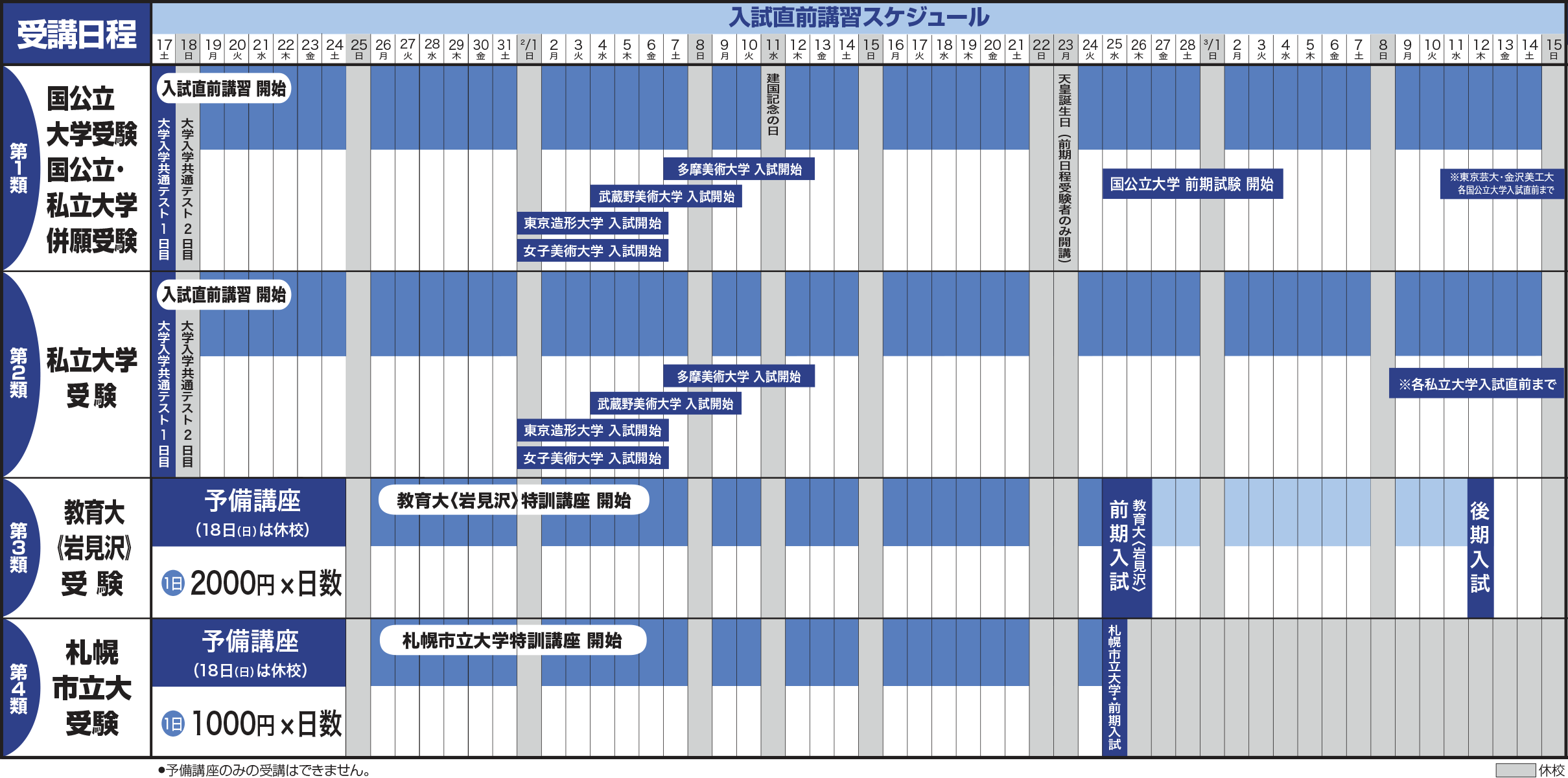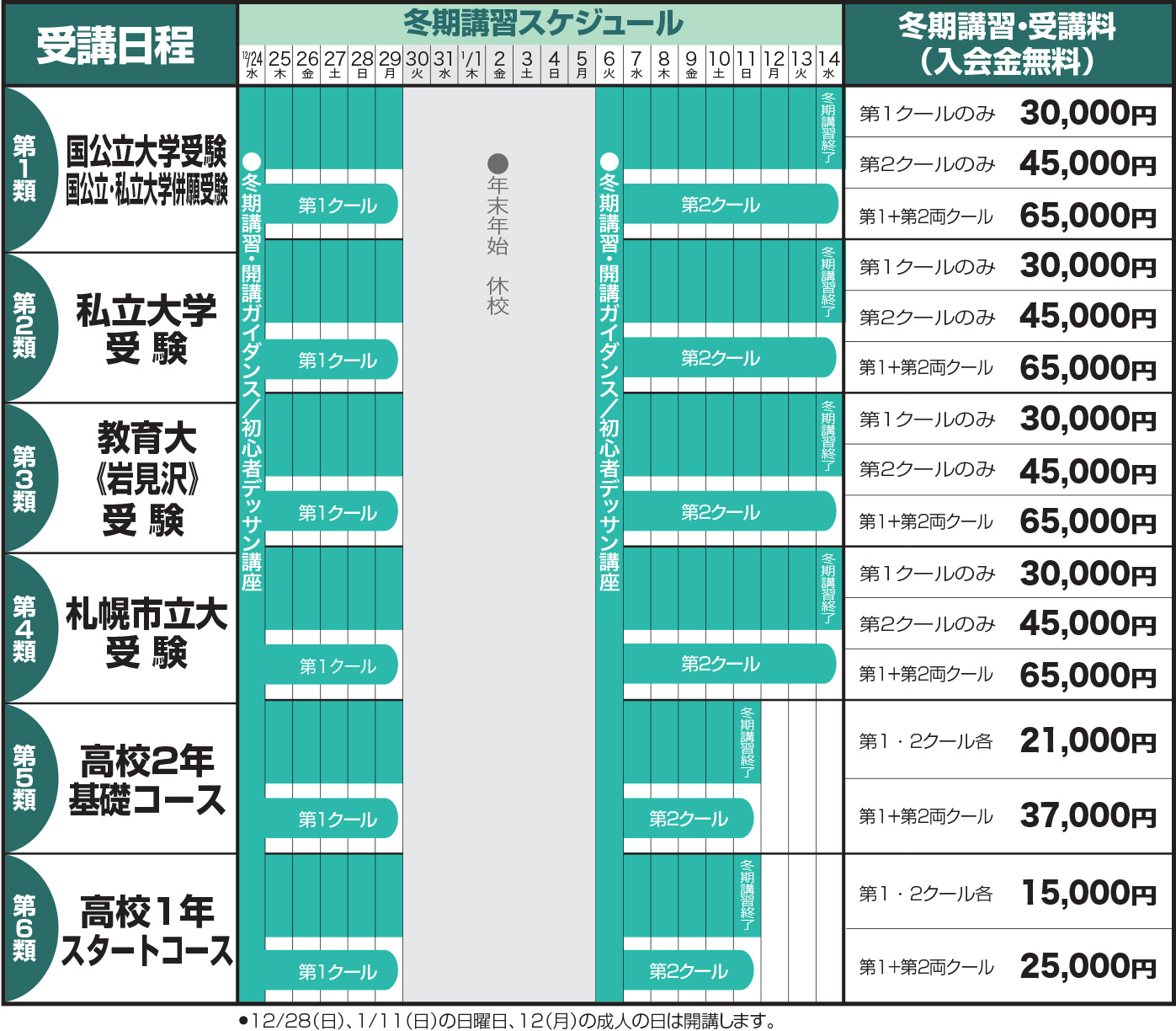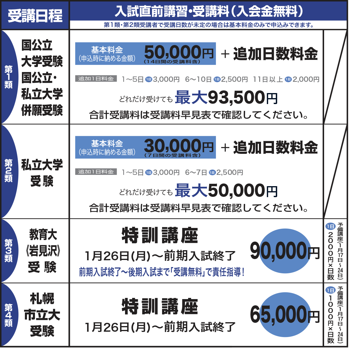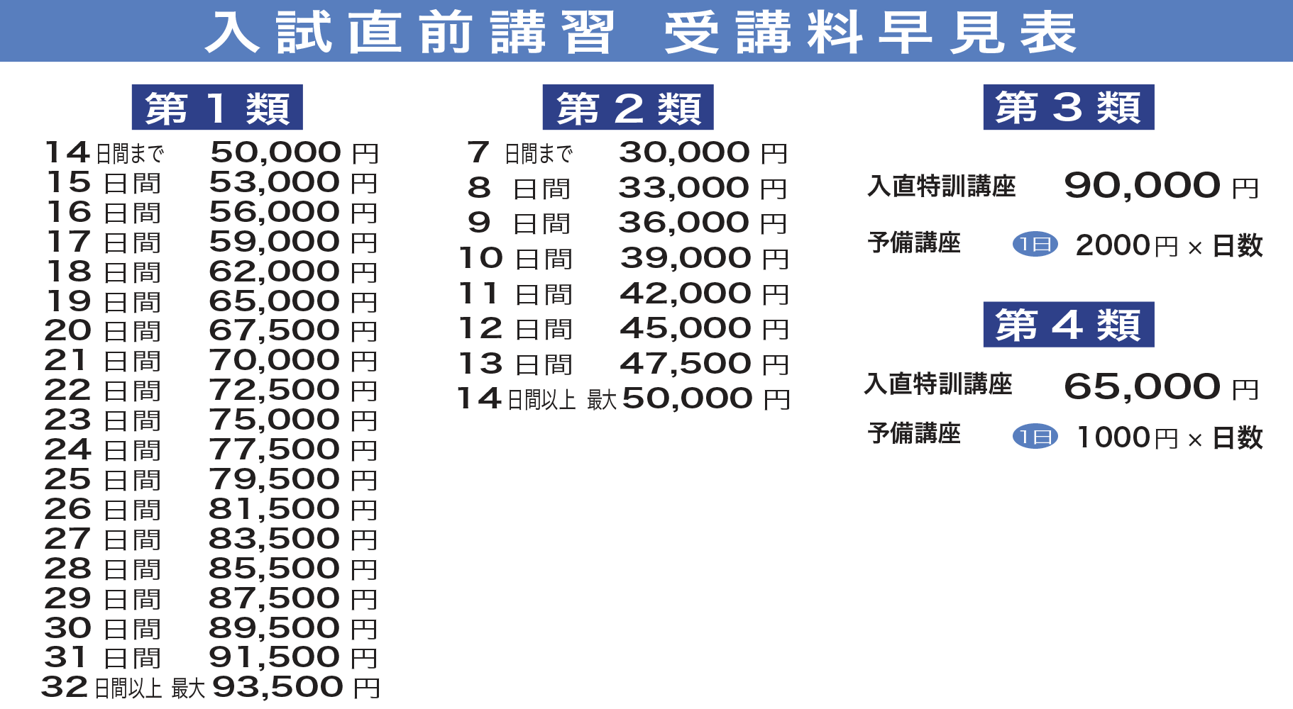 入試直前講習・受講料 入試直前講習 受講料早見表